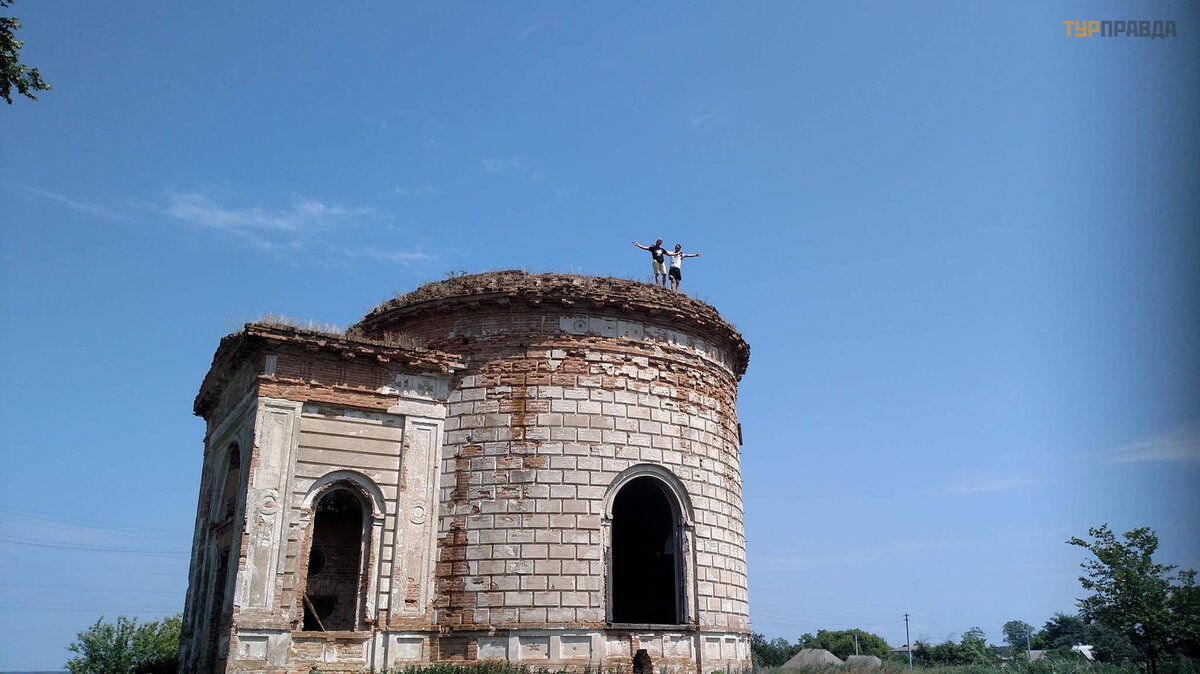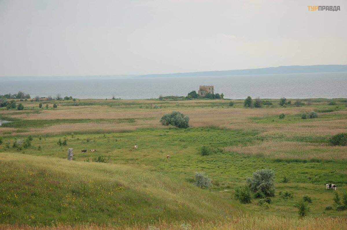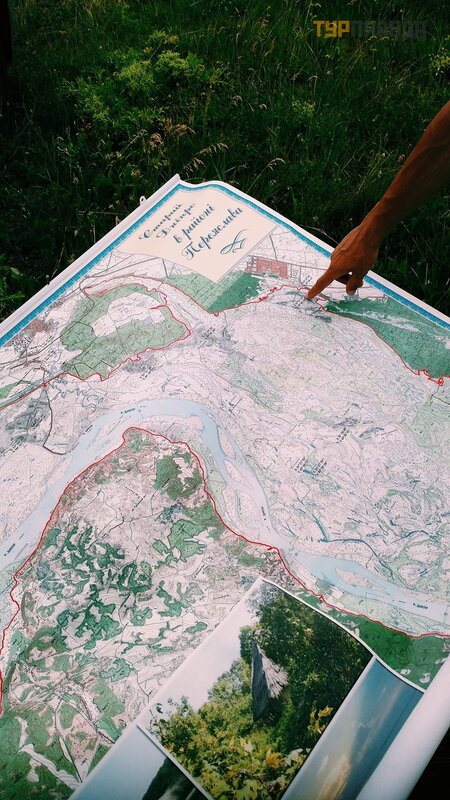 Po tunelu udaliś my się na taras widokowy w wiosce. Cebule. Z tego wyją tkowego miejsca moż na zobaczyć nie mniej wyją tkowy koś ció ł starej zalanej wsi Tsybli, krzyż kozacki, pó ł wysep Trachtemir, miejsce, w któ rym Taras Szewczenko napisał swoje gł ó wne dzieł a i wiele wię cej.