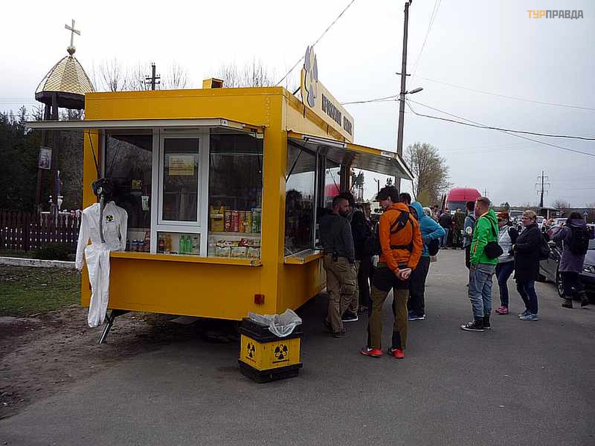 Wszystkie te informacje moż na uzyskać z map i tekstó w objaś niają cych na duż ych stoiskach zainstalowanych w pobliż u budynku punktu kontrolnego. W pobliż u stoi markowy kiosk firmy CHORNOBYL-TOUR, pomalowany na jasnoż ó ł ty kolor. Zdecydowanie nie da się tego nie zauważ yć . W asortymencie znajdują się pamią tki na temat Czarnobyla, jedzenie i napoje. Oferują ró wnież kawę i herbatę . To tylko ceny dzwonią . Nic do roboty. Nie znajdziesz konkurentó w w bezpoś rednim są siedztwie w cią gu dnia z ogniem.