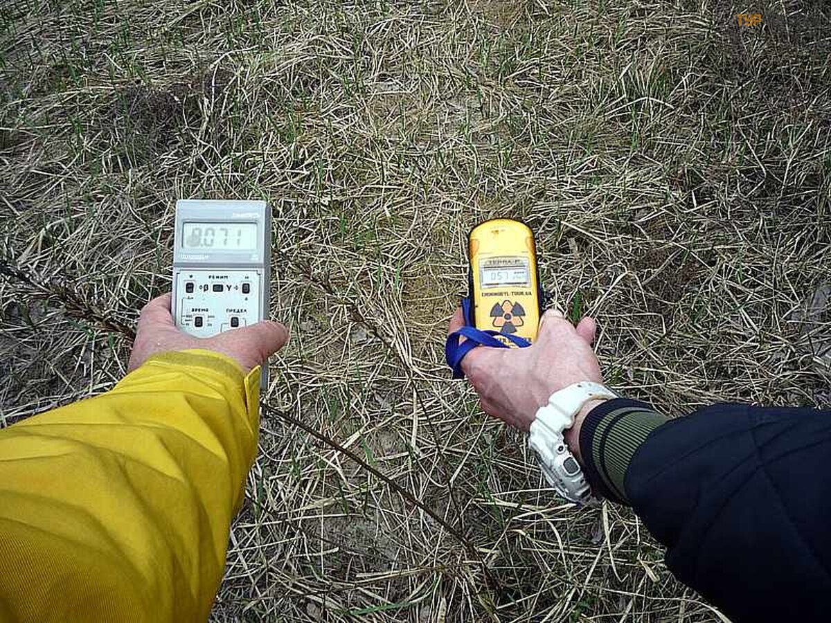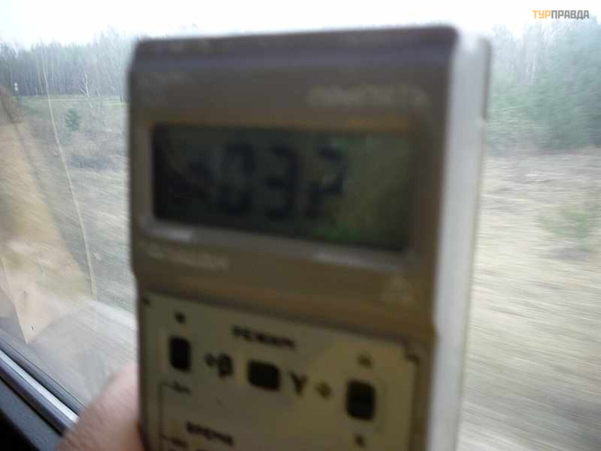 Dozymetry w tym miejscu po prostu się dł awią . I to nawet bez wychodzenia z autobusu, w podró ż y. Jakoś niezbyt przyjemnie jest widzieć liczby na wskaź niku przekraczają ce 1000 mikrorentgenó w na godzinę . Dla poró wnania w Kijowie tł o wynosi okoł o 15 mikrorentgenó w na godzinę . Dobrze, ż e ten odcinek nie jest szeroki, tylko dwieś cie lub trzysta metró w.