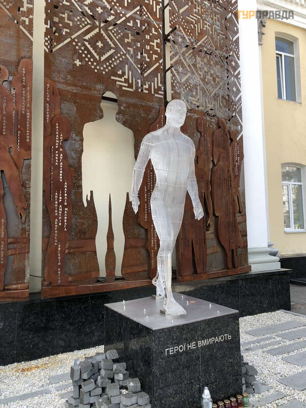 Pierwszy przystanek na placu S. P. Korolev. A to, co od razu rzuca się w oczy, to niezwykł y pomnik Bohateró w Niebiań skiej Setki. Pomnik został odsł onię ty 23 sierpnia 2017 r. w przeddzień Ś wię ta Niepodległ oś ci Ukrainy przed gmachem Ż ytomierzskiej Administracji Obwodowej. Autorami jest mał ż eń stwo rzeź biarzy Julia Gerez-Gladka i Petr Gerez. Pomnik ten poś wię cony jest bohaterom ukraiń skiej rewolucji 2013-2014, któ rzy oddali ż ycie w walce z prorosyjskim reż imem i są powszechnie nazywani Niebiań ską Setką .