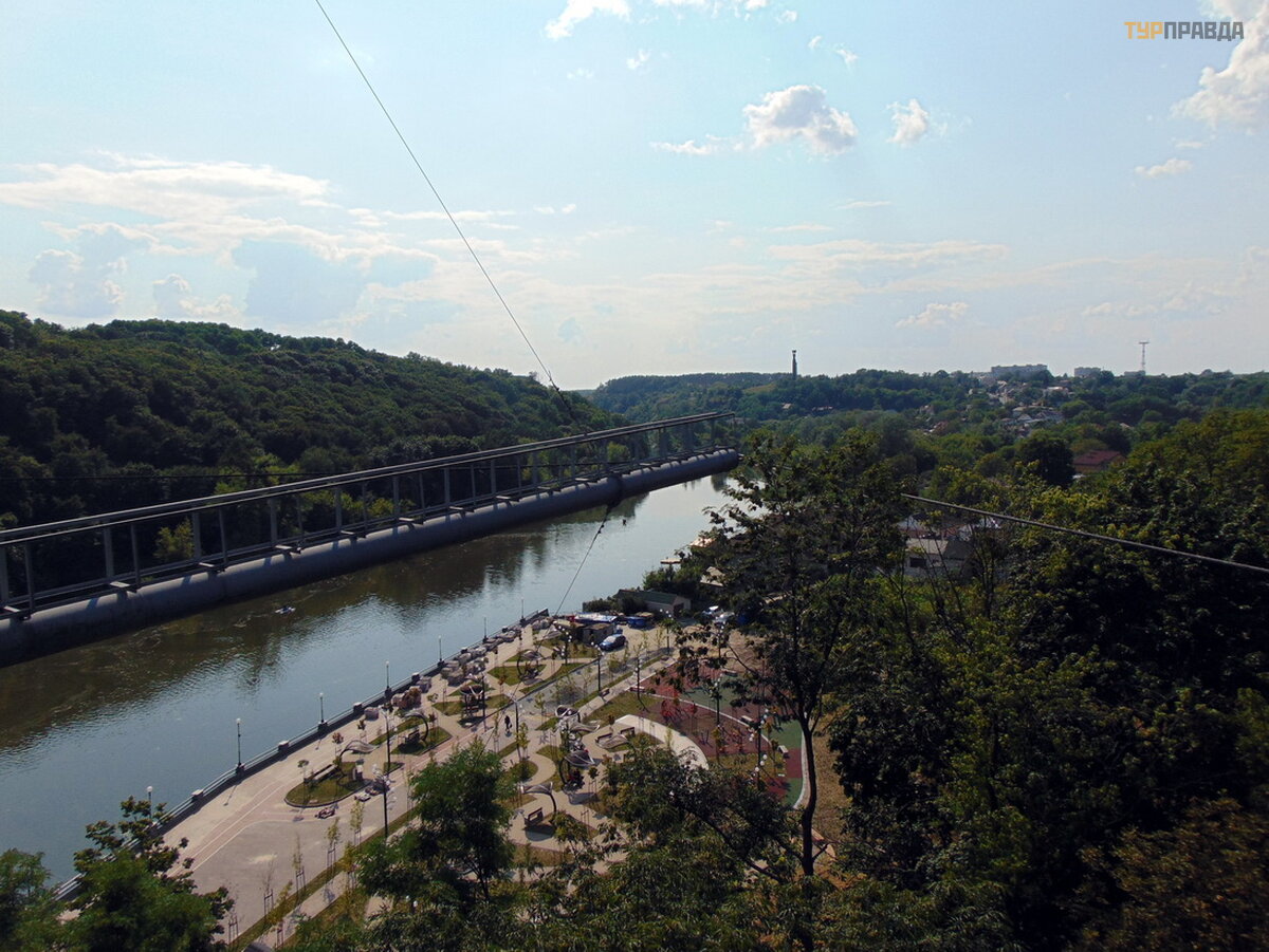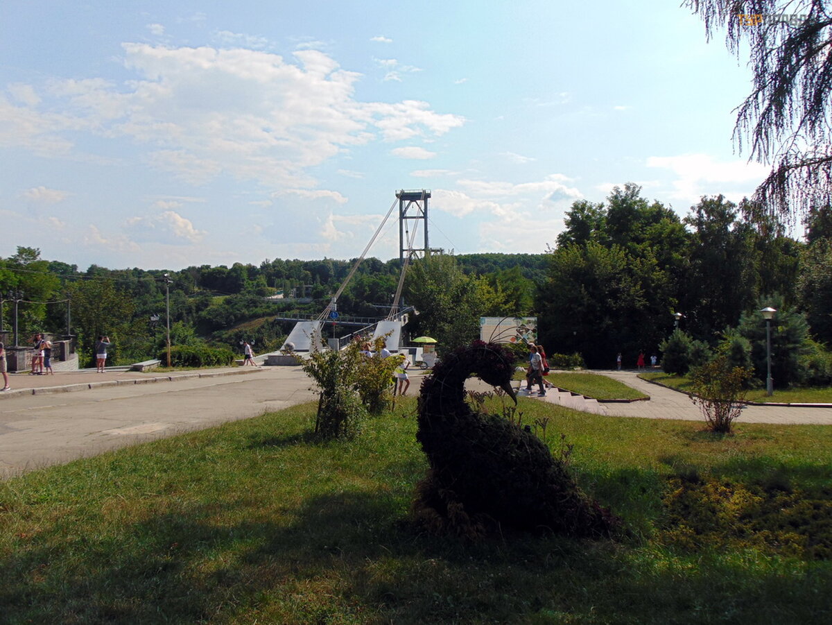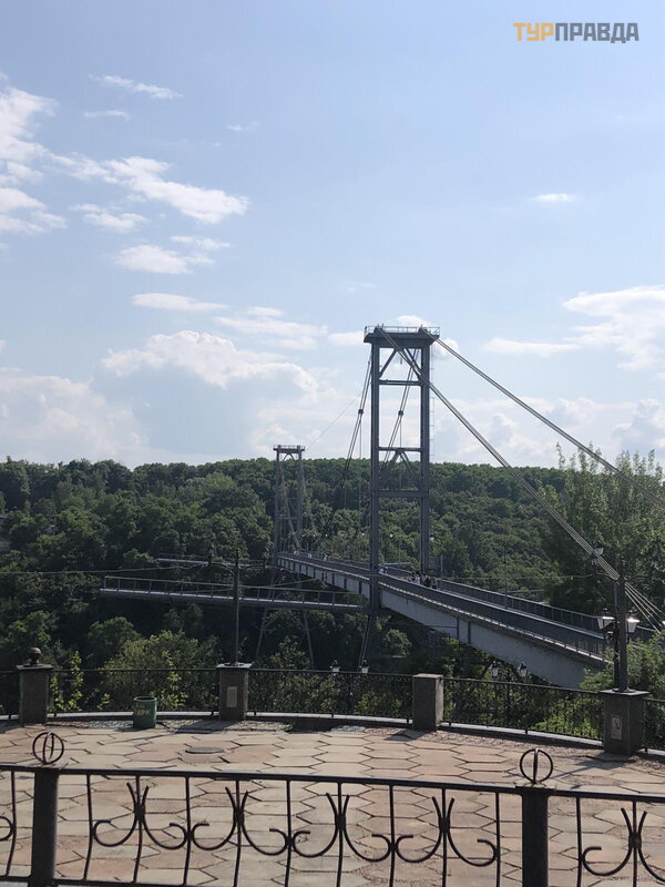 Ta wyją tkowa konstrukcja na metalowych kablach został a zbudowana w 1982 roku jako czę ś ć duż ego kompleksu militarnej chwał y. Most rozcią gał się na dł ugoś ci 350 metró w nad stromymi zboczami Teteriewa. Jest mocowany za pomocą stę ż eń , ponieważ wbicie pali w granit był o technicznie niemoż liwe.