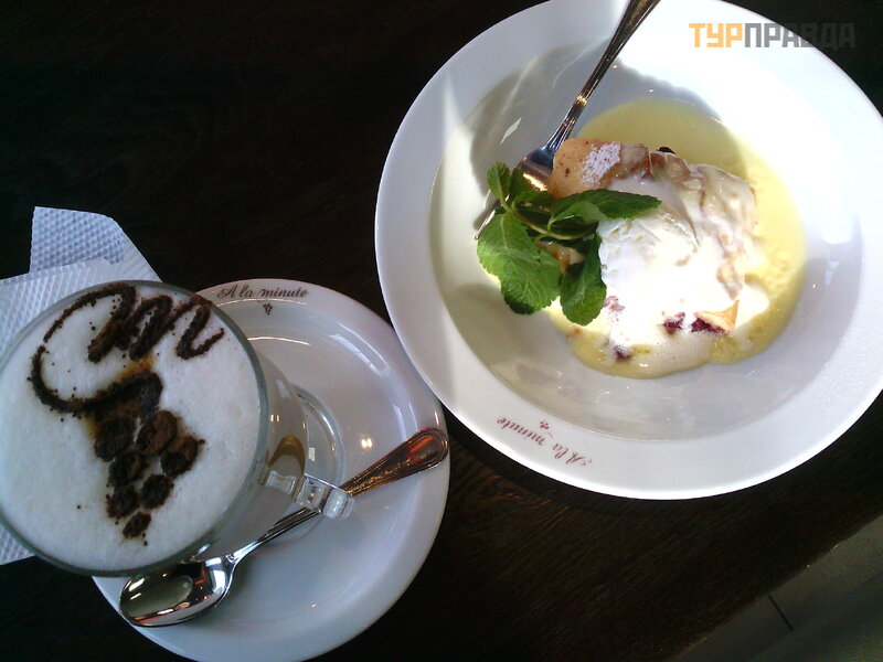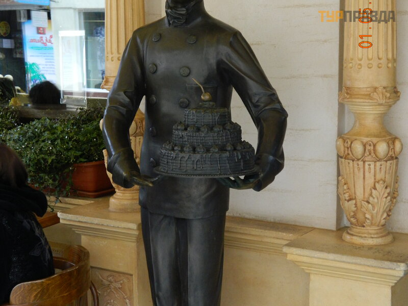 Ł atwo znaleź ć : przejdź przez Plac Pokoju do koń ca, koł o pomnika M. Muncachiego (jego popiersie przypomina nieco popiersie Karola Marksa), skrę ć w lewo w pasaż . A po lewej szukamy postaci szefa kuchni z ciastem posypanym wiś niami: