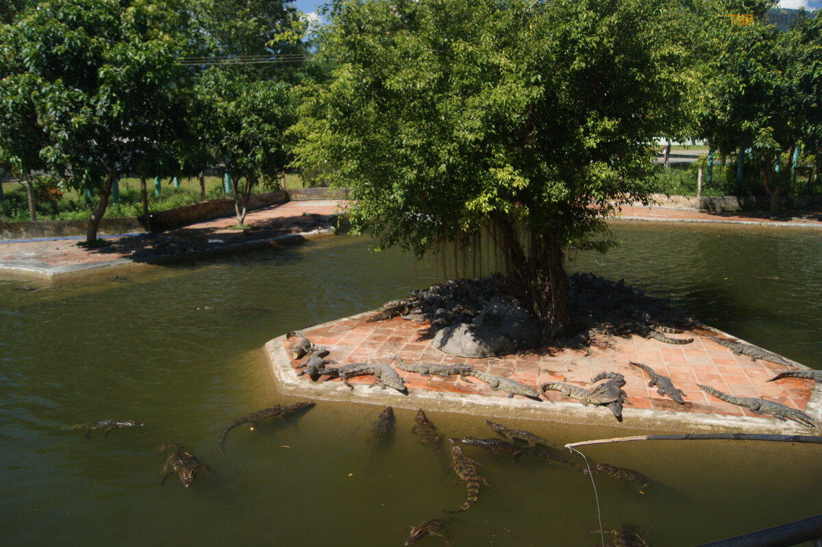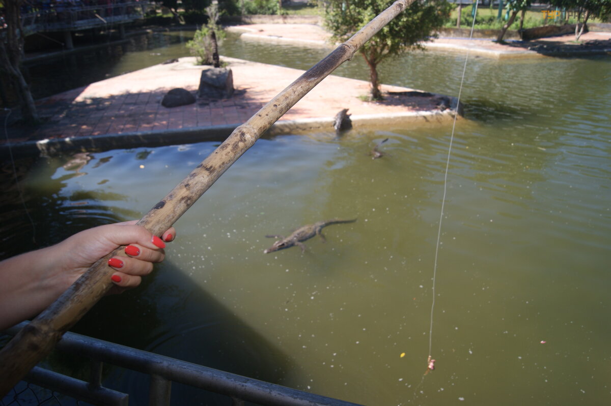 Nastę pnie poszliś my na farmę krokodyli. Istnieje wiele mał ych krokodyli wygrzewają cych się na sł oń cu lub pł ywają cych leniwie w wodzie. Moż na je nakarmić , pracownicy farmy rozdają wę dki z kawał kami mię sa.