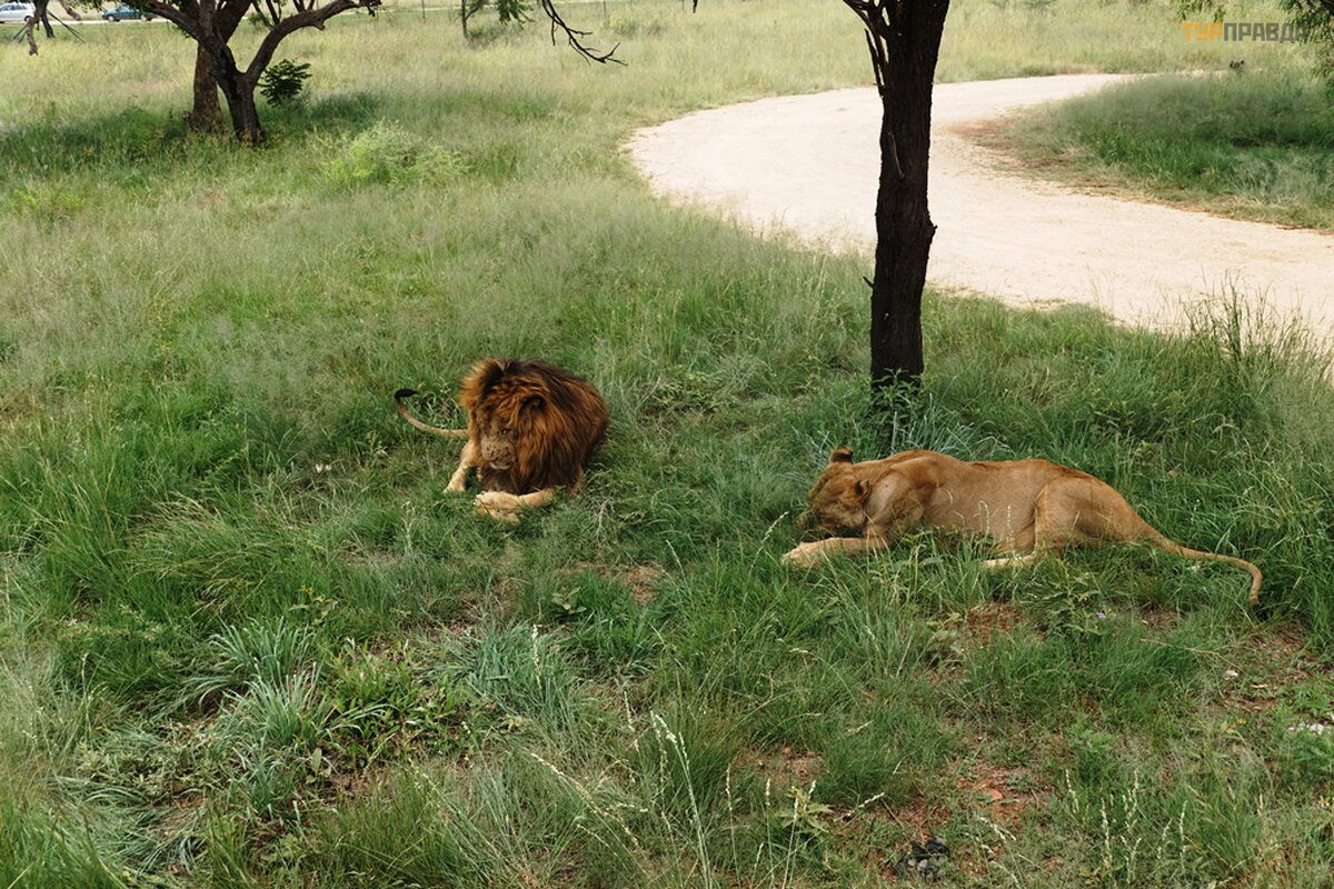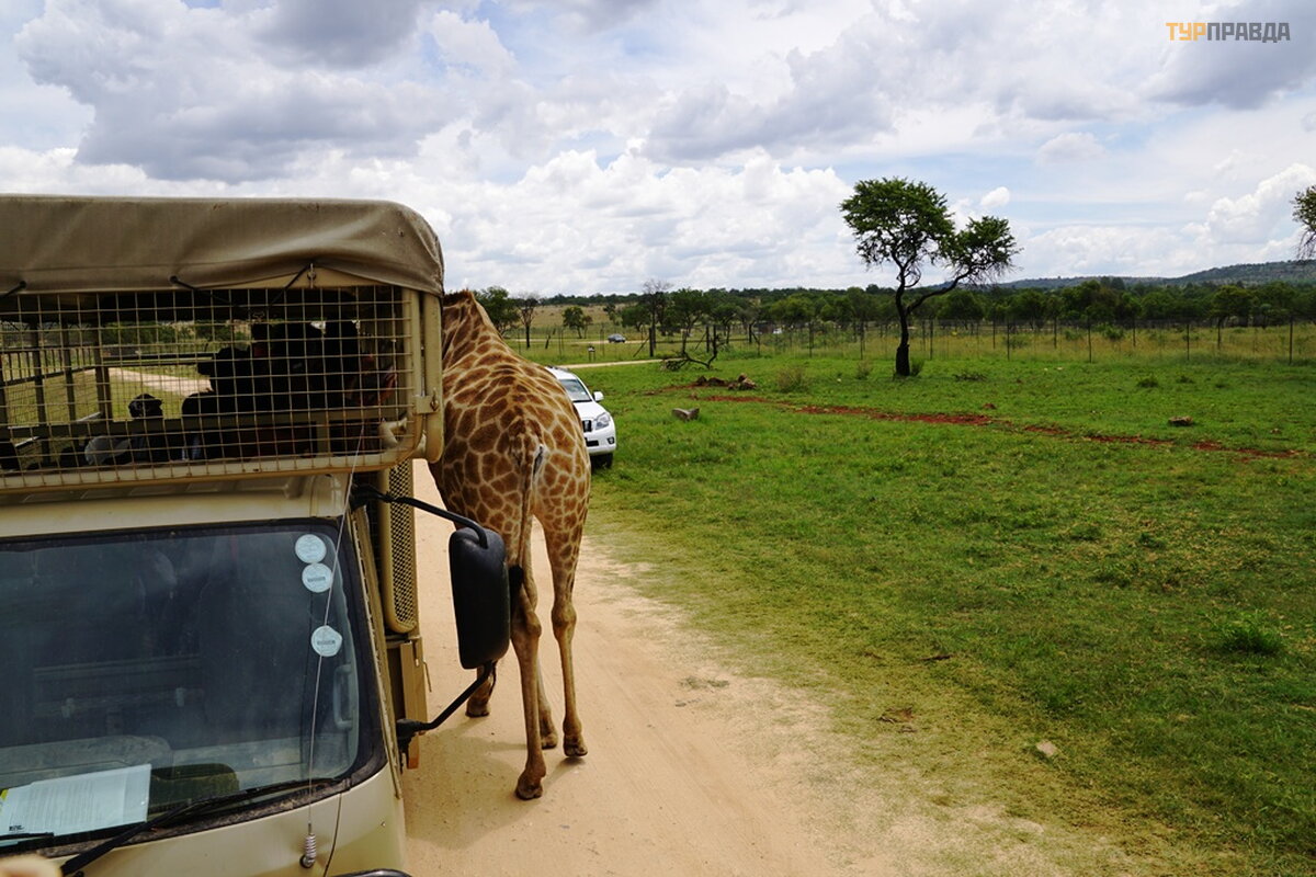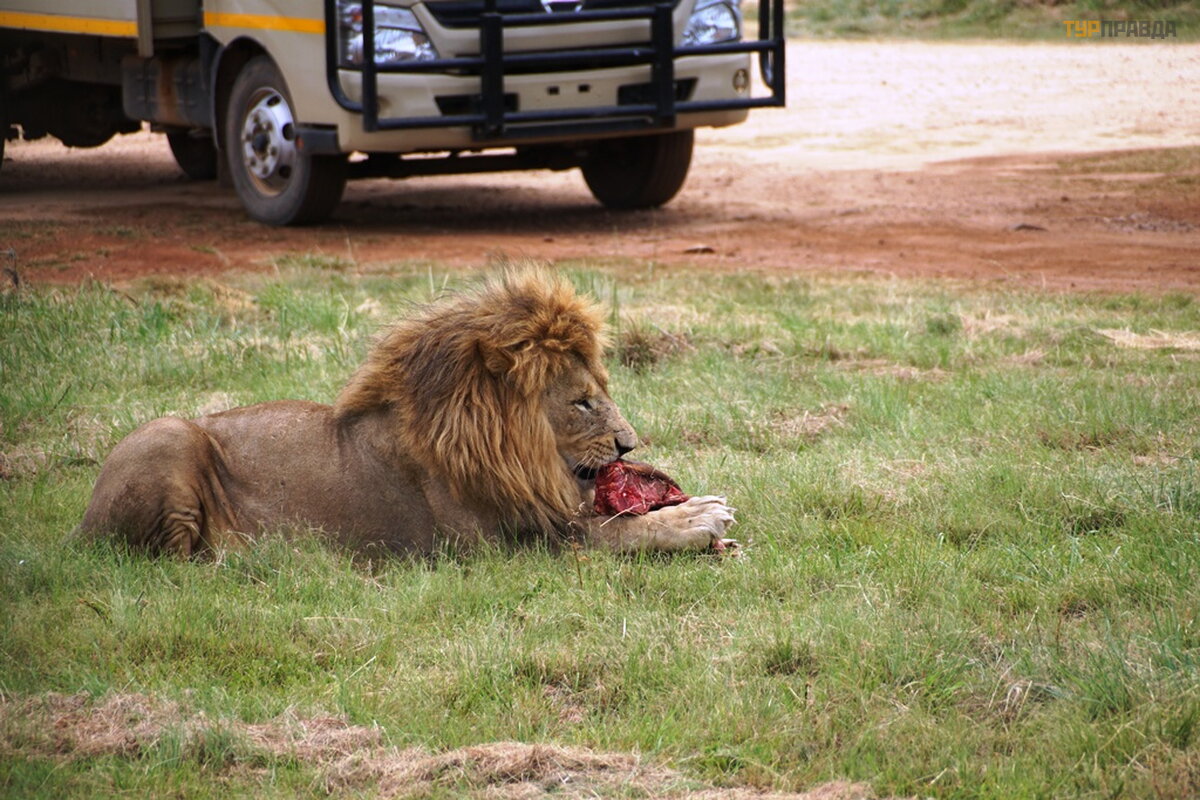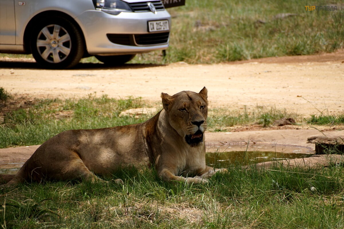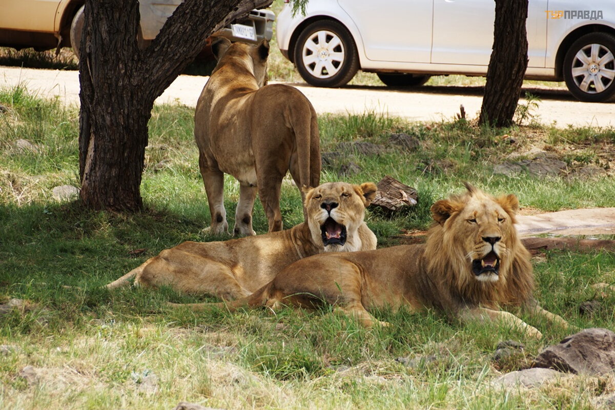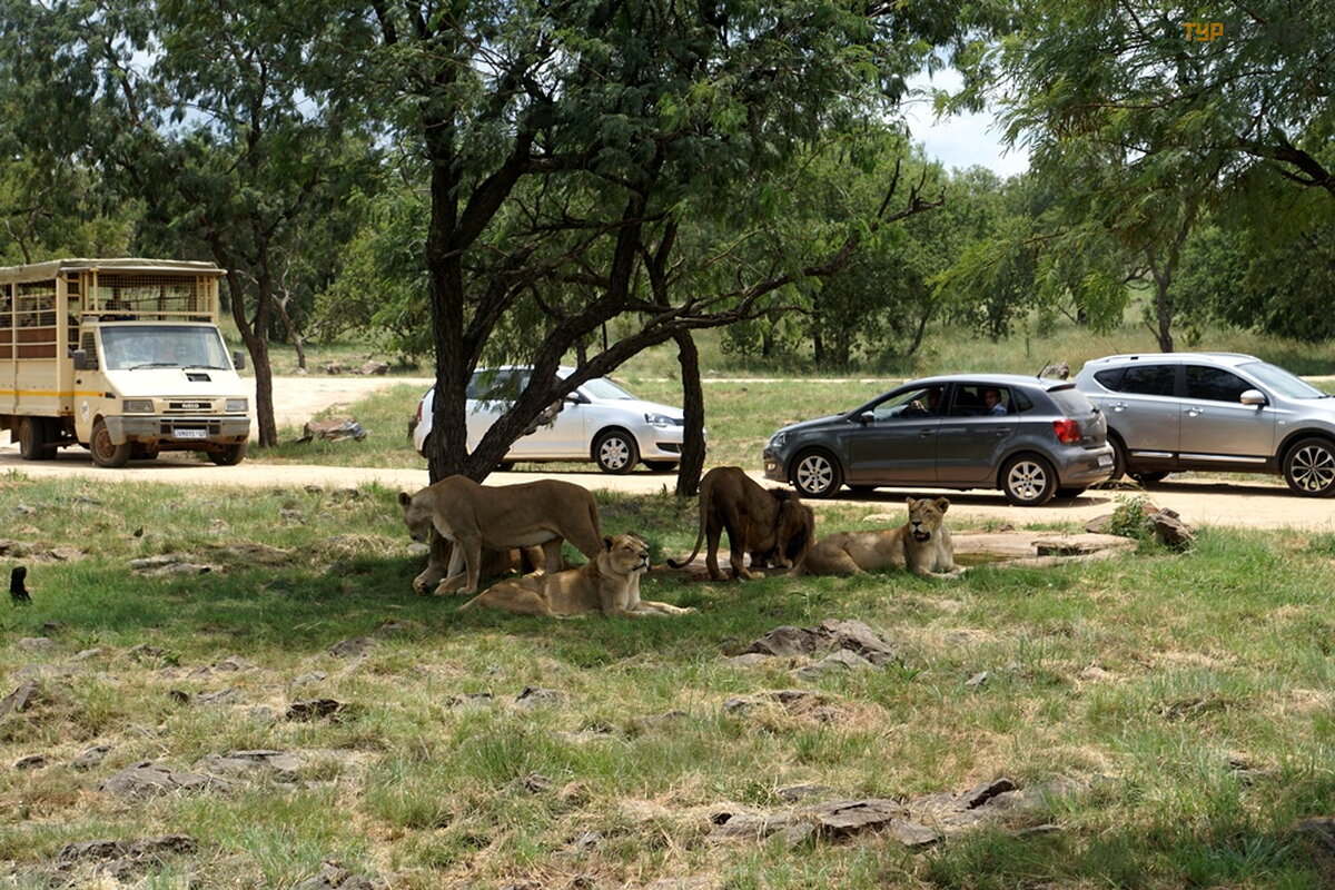 Далее подъехало пять машин с клетками, на которых удобнее заключённых возить, мы двинулись по обширному парку. В моей машине была гид девушка, она же водитель, непонятной национальности. Огненный окрас, причёска, видимо, местных аборигенов, живших лет двести назад. Рассказала о том, что можно, и что нельзя. Нельзя давать львам колбасу, бюргеры, а то они перестанут охотиться и есть сырое мясо. Нельзя подзывать хищников, и трогать их клыки, на предмет того, что настоящие они или нет. Мандарины и бананы львы не едят. Можно только фотографировать через крошечные окошки. Ездили мы более двух часов. Видели разных зверей. Конечно, хотелось бы полежать в тени под деревом рядом со львом, и потрепать его за гриву, но нельзя. Говорят, что он может укусить. А так, как медицина в ЮАР очень дорогая для туристов, то у меня такое желание сразу пропало. Не хотелось бы расспросов страховщиков о том, мол, зачем приставал ко льву? На это страховой случай не распространяется.