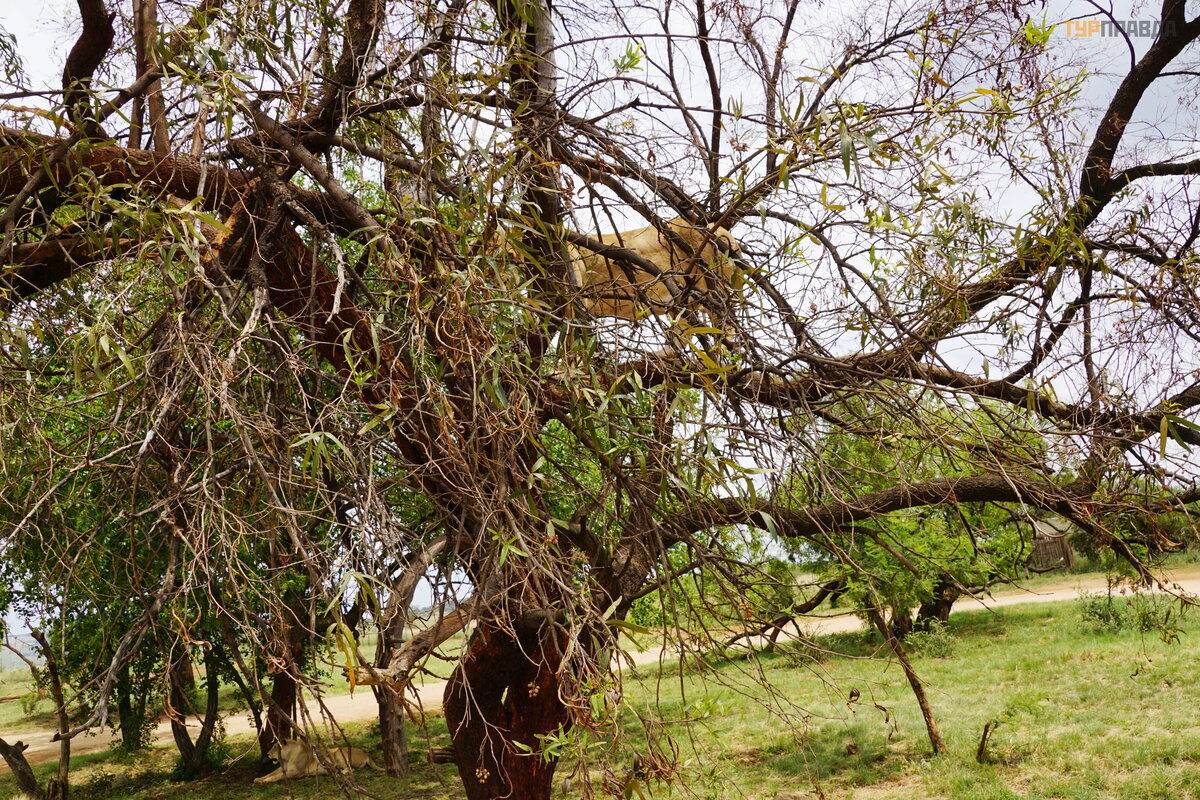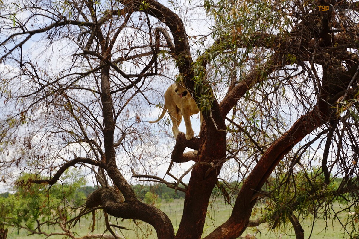 Одна львица запрыгнула на дерево, дразня льва. А Лёва мудрый зверь, и лёг под дерево, зная, что львица всё равно спустится попить видички.