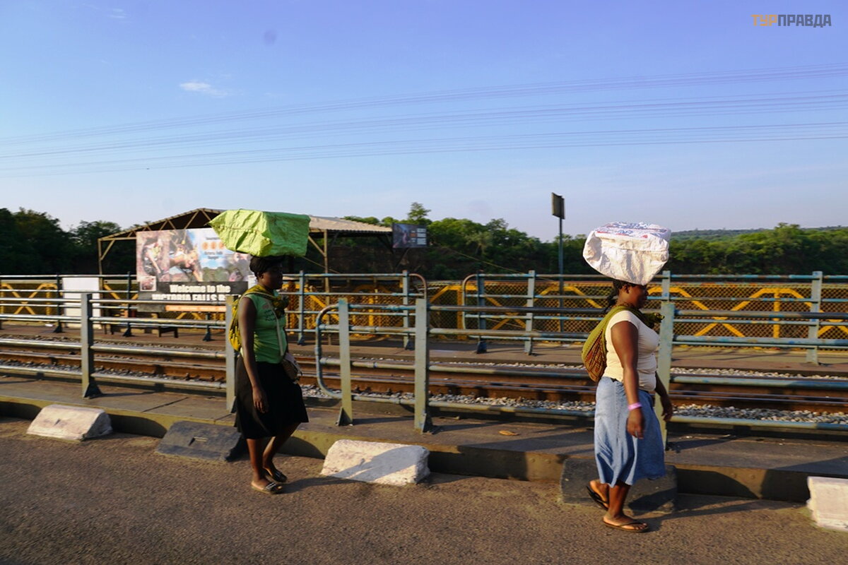 Замбии я решил посвятить весь день, хотя было очень жарко. Встал рано утром и отправился в Замбию пешком. Через два километра первый пост со стороны Зимбабве. Очередь на выезд из Зимбабве для погашения визы. Мне повезло этим утром, так как было мало желающих покинуть страну. Погранец мне посоветовал не ставить штамп в паспорт о выезде из страны, а попросить отрывной талон с печатью. Он оказался прав. Если бы мне поставили печать в паспорт, то пришлось при возвращении из Замбии стать в общую очередь и заново платить за визу. При выходе из зоны мой талон зарегистрировали, и открыли ворота на нейтральную землю в сторону знаменитого моста разделяющего две страны Зимбабве и Замбию. Я читал некоторых туристов, что они запросто проходили на мост без визы. Это не правда, на границе очень строго. В данном случае меня выручила двойная виза. Зайдя на мост я остановился для осмотра прилегающих территорий. Отметился на нейтральной полосе между государствами, и отправился уже по земле Замбии. Через километр пост контроля Замбии. Я увидел огромную очередь, человек двести местных и белых туристов, которые получали визу Замбии. Пришлось мне вздрогнуть, и пропало желание входить в Замбию. В такую жару стоять в очереди для визы не для меня. Хотел повернуть назад в Зимбабве, тем более я из этой страны не выписывался. Затем передумал, прикинулся шлангом, и пошёл прямо на двух солдат. Показал им мой талон и визу в паспорте. Они позвали третьего, посоветовались и меня пропустили на родину их предков. Метров через 900 я увидел вход в национальный парк водопада Виктория Замбии. Решил сравнить водопад двух стран. Уплатил 30 долларов за вход, я в гордом одиночестве проследовал к проходной водопада. Время было 8:00 утра. Ко мне сразу бросились таксисты, менялы, продавцы и мухи. Послал всех, и на проходной меня вписали в книгу и предупредили, чтобы я не прыгал в водопад, не пугал зверей, не хватал за хвост обезьян и не поил их пивом. При подходе к водопаду меня сразу обдало водяной пылью. Фотографировать было не возможно, а воздух был изумительный. Пели птички. Фото получались тёмные, так как солнце было ещё очень низко. Второй совет туристам, заходите в парк водопада Замбии ближе к 11:00, и у вас получатся отличные фотографии. Обойдя весь парк водопада. Я свернул на самую длинную дорожку более километра, которая подходила вплотную к мосту. Сделал несколько снимков, и упёрся в конец забора парка прямо у входа на мост. Тут я заметил большую дырку в заборе. Про себя подумал, как здорово не возвращаться назад более километра, а затем этот километр идти уже по тротуару к этой же точке у моста. Только стал присматриваться к этому проёму, как тут же с другой стороны забора появился юнец, и предложил за деньги провести меня к мосту, где стоял автоматчик, который, мол, меня не тронет, так как он тоже в доле. Я ему сказал, а если не заплачу и пройду? Тогда пограничник тебя застрелит, ответил мне юнец. Пришлось баклажана послать, и идти назад к воротам водопада. Этот путь мне обошёлся в один час пути по жаре. На выходе из парка, я увидел отходящий автобус в город Ливингстон Замбия. Погулял по городку. Симпатичный, но баклажаны и мухи достали. К вечеру вернулся в Зимбабве в свой отель. Вот такой у меня был день 14 января 2018 года.